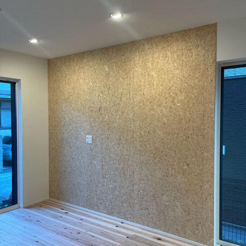壁天井仕上げはホワイトのメインクロスにTV前とキッチンカウンターは『OSB合板』という構造用建材が貼ってありました!!